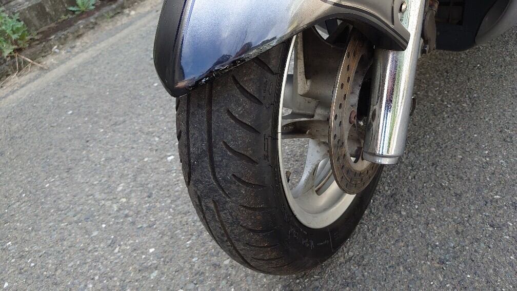 タイヤ溝 F5、R5、右側フロントフォークダストシール破損有り滲み無し、左側フロントフォークダストシールひび有り、オイル漏れ有り、ステムベアリング△