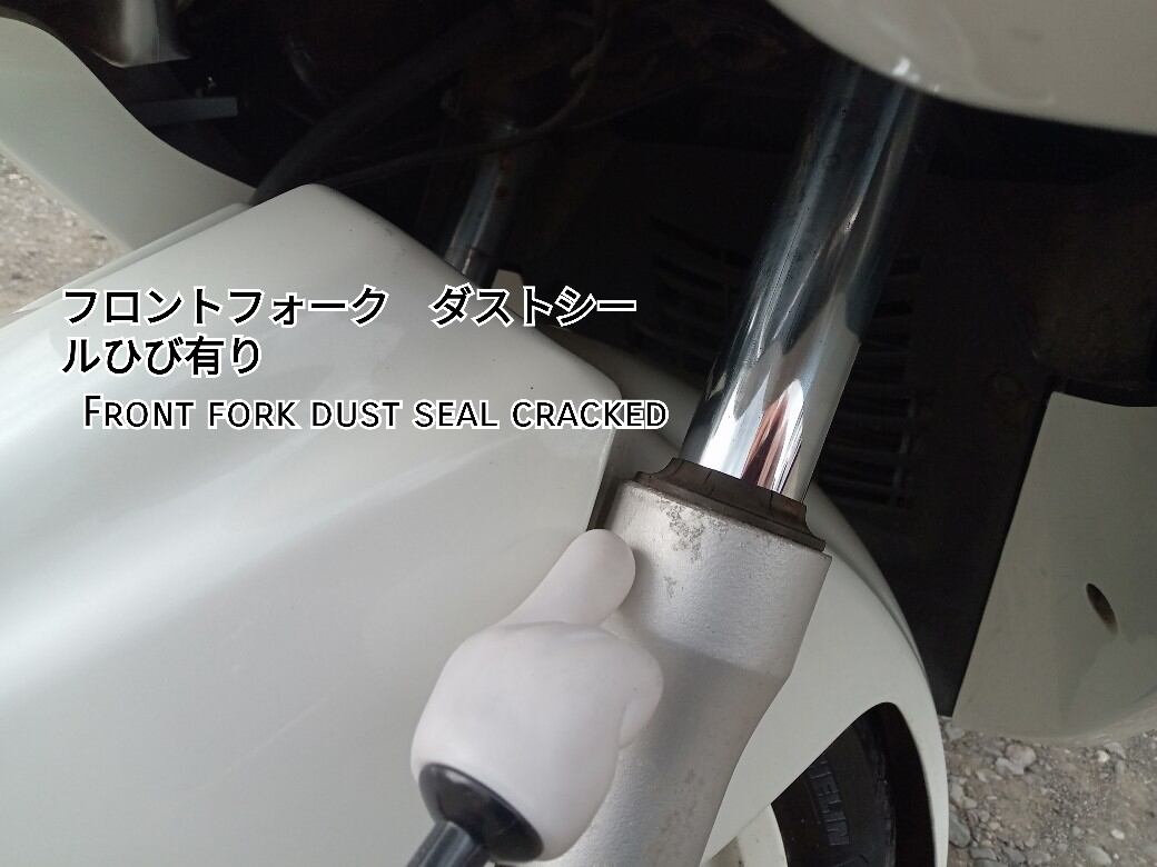 タイヤ溝 F6、R4(エア抜け)、フロントフォークダストシールひび有り滲み有り、ステムベアリング異常無し